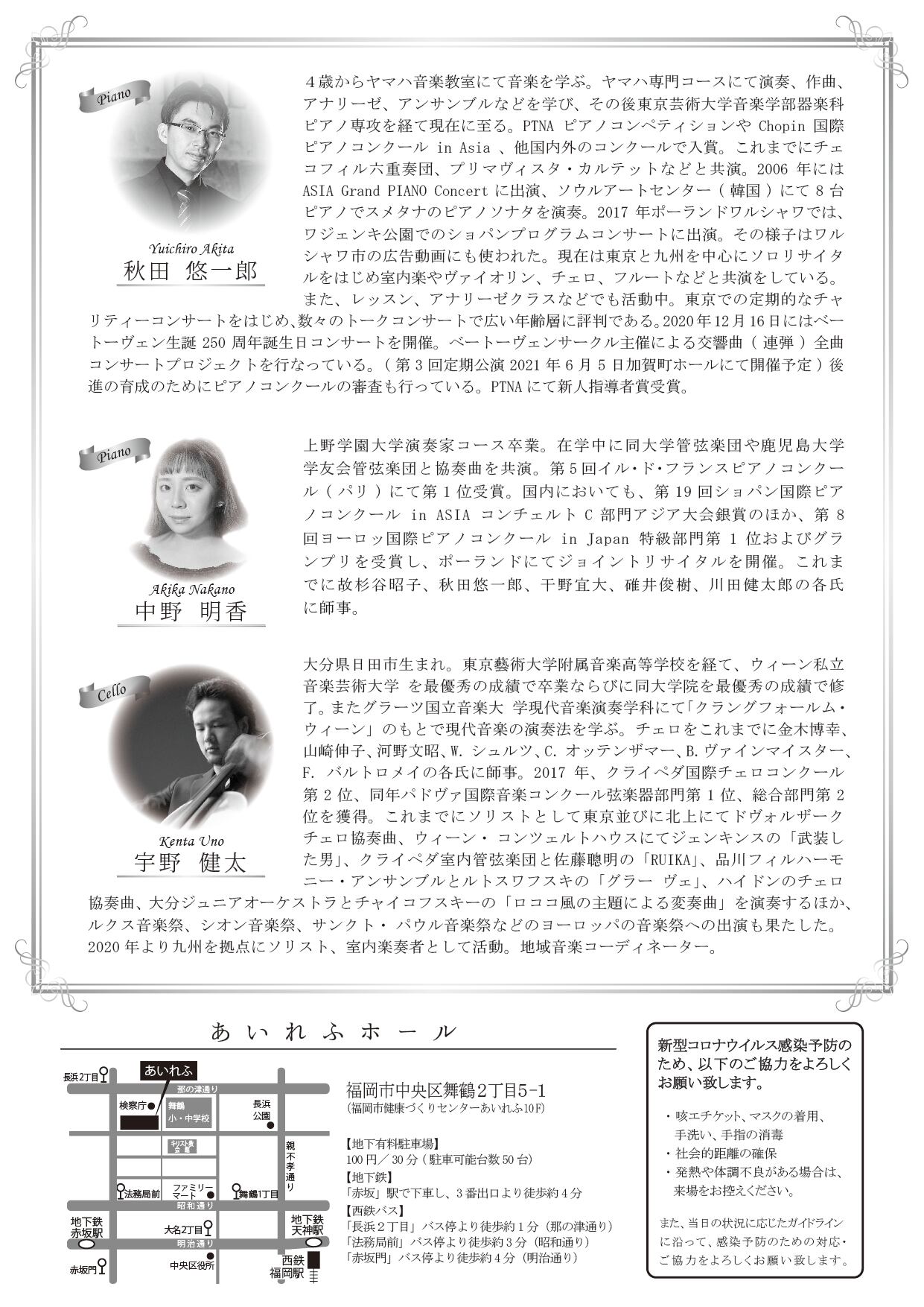 今年は、毎年恒例のパートナーピアニストの中野明香さんに加え、チェリストの宇野健太氏をお呼びして、彼の生誕を祝してコンサートを開きます。